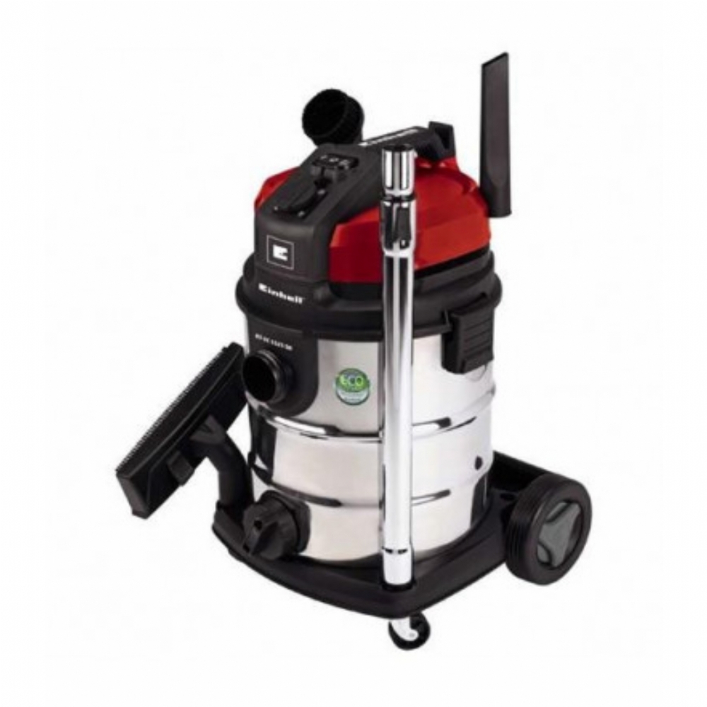 Il bidone aspiratutto TE-VC 1925 SA è un aspiratore di alta qualità, con sistema ECO-POWER, versatile aspirapolvere a secco ed umido per una pulizia accurata. Il motore Bi-Turbo molto silenzioso, grazie all'impiego dei componenti più moderni, consuma il 50% in meno di energia elettrica. Il sistema a 2 vie per l'aria di scarico e l'aria di raffreddamento riduce lo stress sul motore e rende l'aspirapolvere una soluzione ideale su tutti i fronti. Il bidone in acciaio inox da 25 litri offre un'ampia capacità di pulizia, ovunque, in casa e ufficio. Il TE-VC 1925 SA dispone di un pratico attacco con funzione di soffiaggio, per facilitare la pulizia di aree inaccessibili. Un filtro in spugna protegge il motore dallo sporco durante l'aspirazione di liquidi. Per la fuoriuscita facile e pulita dei liquidi aspirati, è prevista una vite di sgocciolamento. Una presa automatica consente a questo aspiratore di essere usato insieme agli elettroutensili. l'aspiratore si avvia automaticamente non appena l'utensile collegato è acceso, e continua a funzionare per un breve periodo anche dopo che l'utensile è spento in modo che la polvere viene rimossa completamente. Questo aspirapolvere a secco ed umido viene fornito con un tubo flessibile di aspirazione da 3 m con regolatore d'aria, un tubo telescopico di aspirazione in acciaio inox, un ugello reversibile umido e secco piano, un adattatore per il collegamento di dispositivi elettrici, una ugello piccolo per angoli e di una bocchetta per tappezzeria. Il sacco di raccolta della polvere e il filtro a pieghe fanno un buon lavoro durante l'aspirazione di polveri fini e altro. Un pratico scomparto per minuteria e un supporto per gli accessori consentono che tutte le parti siano conservate ordinatamente sul pulitore stesso, dove saranno sempre a portata di mano. Fornito di rotelle per un semplice spostamento.
